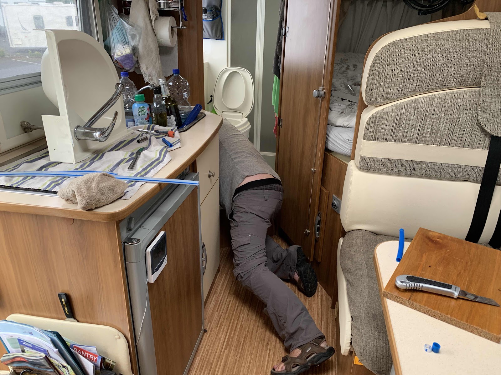 We waited at Sweeney Repairs for someone to turn up just after 9am. Luckily he had the right size pipe and Mark got to work, taking the bathroom sink out and replacing all the pipes (€20). 3 hours later we had no more leaks and all was put back together.
